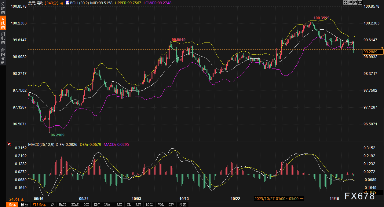 美元指数的240分钟图显示其短期面临压力。价格已运行于布林带中轨99.52下方,并向下轨99.28靠近,布林带整体有轻微开口向下的迹象。MACD指标的DIFF值为-0.0821,DEA值为-0.0679,处于零轴下方且呈空头排列,暗示短期下行风险尚未解除。近期关键支撑位于99.28(布林带下轨)至99.05(近期波动低点)区域,而上方阻力则看向99.52(布林带中轨)乃至99.76(布林带上轨)。美元指数的走势与美债收益率高度关联,若美债收益率无法有效上行,美元也难以获得强劲动力。交易时段内需关注其对美债收益率变化的敏感度。
