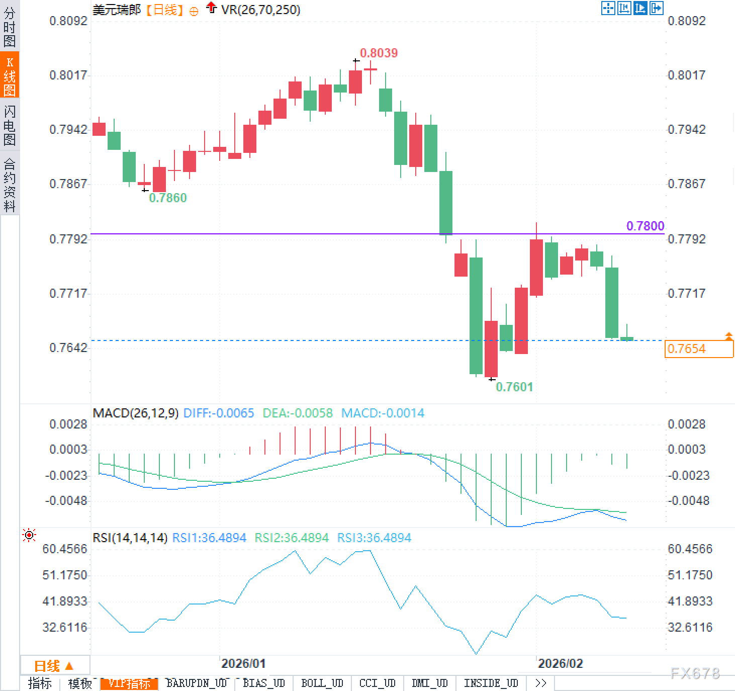 从技术图形看,美元兑瑞郎自高点0.8039回落以来,已连续跌破多个重要关口,最终加速探至0.7601,目前价格正处于前期低点上方不远的位置。这意味着市场正在测试关键支撑区域的有效性。MACD指标显示DIFF为-0.0065,DEA为-0.0058,整体仍处负值区间,说明中期动能尚未翻转;RSI为36.4894,虽接近弱势区但未达超卖极端,符合下跌后盘整的技术特征。